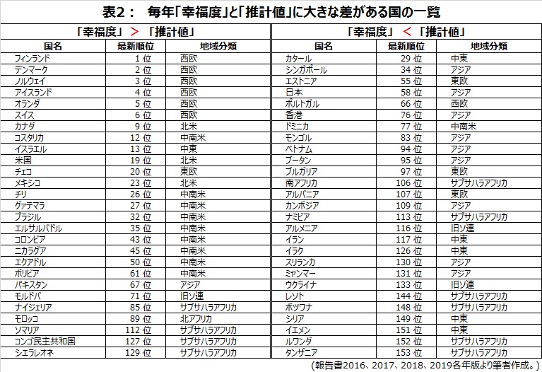 ![]() 先日「2019年版世界幸福度報告書(World Happiness Report 2019)」が発表された。初めて発表された2012年に44位だった日本の幸福度は、最新版では58位と過去最低、先進7か国では最下位だ。(国連「持続可能な開発ソリューションズ・ネットワーク」より) この結果をどう見るかはさておき、そもそも幸福度とは一体何なのだろうか? ■幸福度とは何か 国連版幸福度について、時事通信はこう報じている。 報告書は各国の1人当たりの国内総生産(GDP)や社会支援、健康寿命、寛容さなどを基準に16~18年の幸福度を数値化し、順位付けした。 だが、これは説明不足だ。実際には、アンケート(※)で得た主観的幸福度に関する回答を、国ごとに平均したのが国連版幸福度だ。主観的幸福度とは、本人が感じる幸福感を何らかの方法で測定したものである。(※ 各国各年の調査対象は約1000人で、前年までの3年間が集計の対象となる。) 報告書で主観的幸福度の測定に用いたのが、「キャントリルの梯子(the Cantril ladder)」の質問だ。回答者は、「ありうる最悪の人生」を梯子の0段目、「ありうる最高の人生」を梯子の10段目と考え、現在自分がその梯子の何段目にいるのかを答える。「理想の人生」の現在の達成度を問う質問だ。評価の“ものさし”となる最悪や最高は、回答者自身が設定する。 その上で報告書は、 (1)一人当たりGDP、(2)社会的支援、(3)健康寿命、(4)人生選択の自由度、(5)寛容さ、(6)腐敗認知度等との関係を分析し、幸福度がそれぞれの指標によってどのくらい影響されるのかを示している。各指標を基準に幸福度を数値化したのではなく、アンケート調査によって与えられた幸福度という指標を、他の6つの指標を使ってどうにか分解してみました、というわけだ。(各指標の内容については、記事末尾の文末注を参照。) ■足を引っ張ったのは「人生選択の自由度」と「寛容さ」なのか 6つの指標に関して、日本の評価はそれほど悪くはない。健康寿命は世界最高水準で、一人当たりGDPも上位だ。腐敗認知度と社会的支援も幸福度の順位よりは良い。それ以外の2つ、人生選択の自由度と寛容さが足を引っ張った、というのがもっぱらの評価だ(参照・日本の幸福度、過去最低の58位 「寛容さ」足引っ張る 朝日新聞デジタル 2019/03/20)。 だが、こうした見方には疑問が残る。 表1では、2年連続幸福度1位となったフィンランドと日本について、幸福度への各指標の影響度を比べている。両者の差を見ると、確かに人生選択の自由度と寛容さは足を引っ張っているのだが、そのレベルは6つの指標の中で特に際立つものではない。では一体なにが、フィンランドと日本の幸福度に大きな違いをもたらしているのだろうか? 報告書の分析を信じるなら、その差の大部分は、実際に測定された幸福度とその推計値との誤差だ。この誤差を残差という。表に示すとおり、両者の「残差」の差は、幸福度の差の約7割(=1.315÷1.883)に相当する。 アンケート調査で得られた幸福度と、それを回帰分析と呼ばれる方法で推計した推計値の間には、この残差と呼ばれる誤差が必ず生まれる。一般的な推計の手法では、「残差」の二乗を合計した値が最も小さくなるように、各指標の係数を調整する。調整した結果、すべての国について「残差」がほとんどなくなれば話は簡単なのだが、そうはならないのが普通だ。国連版幸福度のように、他の指標の影響度と比べ相対的に大きくなる場合もある。 幸福度が58位だった日本は、推計値で見れば26位になる。何らかの要因で、推計値よりも幸福度が低くなっているわけだ。こうした傾向は今回に限らず、少なくとも2016年版以降は毎年同じ偏りがある。逆にフィンランドは、幸福度が推計値を常に大きく上回る。 残差の偏りは、幸福度と推計値との関係に偏りがあることを意味している。 ■幸福度と推計値の関係は偏っている 日本とフィンランド以外にも、幸福度と推計値に“常に”大きな乖離が見られる国は少なくない。これを一覧にしたのが表2である。国ごとの偏りに加え、西欧、北米、中南米、オセアニア等で幸福度が推計値より大きく、逆にアジアや中東では幸福度の方が小さく測定されるという、地域ごとの偏りもありそうだ。 こうした偏りが生まれる要因としては、 (1)6つの指標以外の他の要因が幸福感に大きく影響している (2)6つの指標の中に特定の国・地域でだけ幸福感への影響度が異なるものがある (3)国・地域特有の要因が幸福感に大きく影響している (4)幸福感とは無関係な理由で「キャントリルの梯子」の質問への回答が偏る国・地域がある 等が考えられよう。 これらの要因を具体的に明らかにするのは簡単ではないが、偏りの主因は(4)の「幸福感とは無関係な理由」ではないかと筆者は考えている。質問の内容にかかわらず採点方式アンケートへの回答に現れる傾向が、国や地域ごとにあるのではないだろうか。 ■「どちらでもない」「わからない」が多い国、日本 他国と比べ「どちらでもない」や「