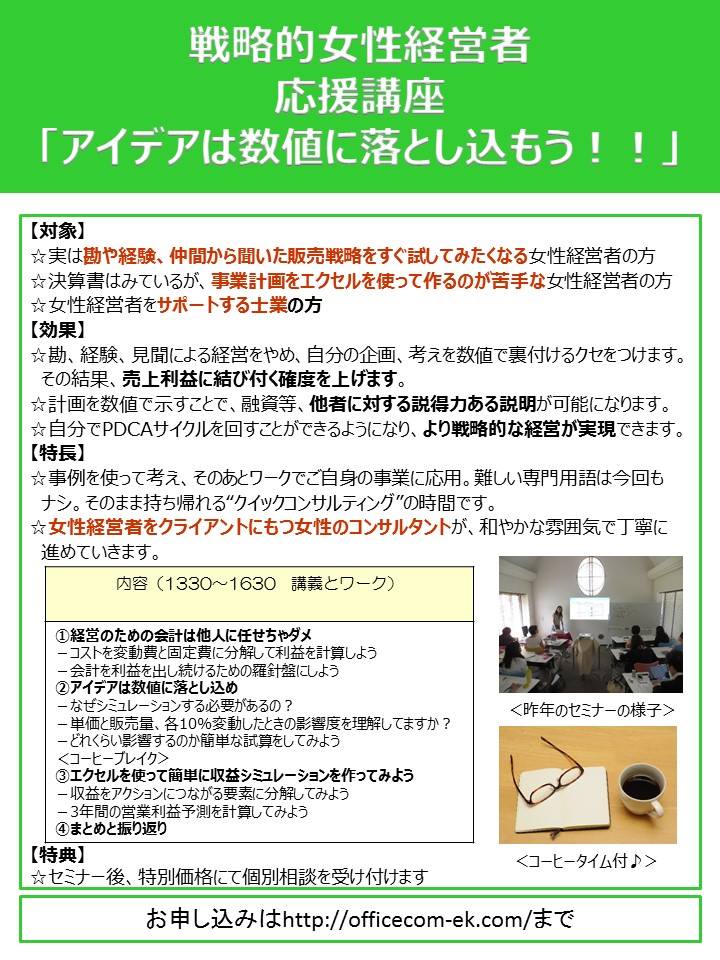 思いついたアイデア。確実に売上利益に結び付けたいですよね。でも、せっかくのアイデア、こんな風に決めていませんか? □今までの経験でうまくいった方法だから。 □今お客様に対応している中から編み出した方法だから。 □同業者がやっていて、これなら絶対にうまくいくと聞いたし実際その仲間もうまくいっているから。 素敵な(可能性がある)アイデアも、勘/経験/見聞だけでは心もとないもの。 だからこそ、ちゃんと数値に落としてシミュレーションしてから実行に移すことが大事です。 講座では管理するべき経営数値を確認。エクセルを使ってシミュレーションします。エクセルの難しそうなワザ(マクロや関数)は一切使いません。四則計算ができれば大丈夫。 自分の計画が実現する確度を上げていきましょう。 【2015OfficeCOM自主セミナー第一弾!】思いついたそのアイデア、ちゃんと数値に落とし込んでいますか? | OfficeCOM 【ひとことで言うと】 思いついたアイデアを数値化し、売上利益に結び付く確度を上げるようにすべき準備事項がわかります。 【聴いてほしい人とその効果】 ・女性経営者の皆様は、勘経験見聞による経営をやめ、数値根拠に基づいた戦略的な経営を実現 ・女性経営者を支える士業の皆様は、数値に基づきポイントを押さえたサポートが可能に。 *男性も歓迎いたします 【なぜ私がお伝えするのか】 ・独立以来、会計を専門分野のひとつとし、大学で管理会計について社会人向け講義を継続する中、皆さんがわかりづらいポイント、売上利益に結び付けるポイントをお伝えする必要性を感じてきました。まずはアイデアを数値に落とし込み、それで売上利益がどうなるのかを計算するところから始めましょう。 【内容】 ①経営のための会計は他人に任せちゃダメ -コストを変動費と固定費に分解して利益を計算しよう -会計を利益を出し続けるための羅針盤にしよう ②アイデアは数値に落とし込め -なぜシミュレーションする必要があるの? -単価と販売量、各10%変動したときの影響度を理解してますか? -どれくらい影響するのか簡単な試算をしてみよう <コーヒーブレイク> ③エクセルを使って簡単に収益シミュレーションを作ってみよう -収益をアクションにつながる要素に分解してみよう -3年間の営業利益予測を計算してみよう ④まとめと振り返り ―――――――――――――――――――――――― 【開催概要】 2015年5月27日(水)13:30〜16:30 場所:品川TKPアネックス 価格:10000円(振込の方は8000円) 定員:先着20名様限定 ※キャンセルポリシー お振込みの方は一律8000円 5月20日まで:全額返金 5月25日まで:5000円返金 (いずれも税別金額です。振込手数料はご負担ください) 5月26日以降:全額ご負担 ***お申込みは以下リンクの一番下にあるお申込みフォームからお願いいたします*** http://officecom-ek.com/?p=548 ※各種セミナー・講演・サービス等に関するお問い合わせは主催者・サービス提供者に直接ご連絡下さい。 シェアーズカフェ・オンラインより。 シェアーズカフェ・オンラインからのお知らせ ■シェアーズカフェ・オンラインは2014年から国内最大のポータルサイト・Yahoo!ニュースに掲載記事を配信しています ■シェアーズカフェ・オンラインは士業・専門家の書き手を募集しています。 ■シェアーズカフェ・オンラインは士業・専門家向けに執筆指導を行っています。 ■シェアーズカフェ・オンラインを運営するシェアーズカフェは住宅・保険・投資・家計管理・年金など、個人向けの相談・レッスンを提供しています。編集長で「保険を売らないFP」の中嶋が対応します。 |