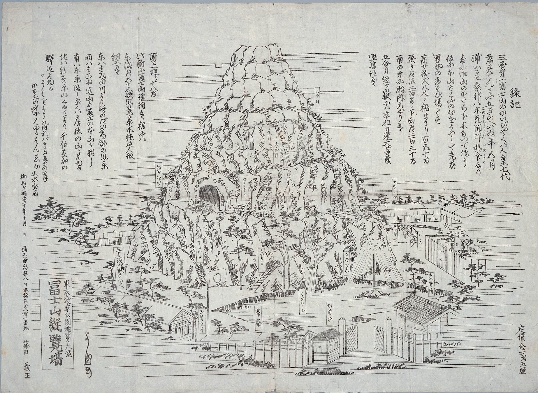 東京を代表する観光名所である東京タワー。現在はコロナ禍で観光客が激減しているが、コロナ前は年間250万人前後の人が訪れていた。 東京タワーは電波塔として実用的な側面があることはよく知られている。だが、地上150メートルの展望台に神宮が祀られていることは意外と知られていない。 地上150メートルということで、東京23区で最も高い場所にある神社だ。一体なぜ、こんな高い場所に、わざわざ神社が造られたのか? 現代人の私たちからすると一見突飛にも思えるが、古来の文化や思想を踏まえると、こんな高い場所に神社が造られた必然的な理由が分かる。 当時の絵画資料等をもとに塔の歴史と東京タワーに神社が存在する理由を解説したい。 ■タワー大神宮の誕生 東京タワーの正式名称は「日本電波塔」。関東地方にテレビやラジオの電波を送信する総合電波塔として昭和33年(1958年)に建てられた。 東京タワーはそれ以前、テレビ局ごとに建てていた電波塔を統合する役割を担うと同時に、東京のランドマークとして開業したが、当初、東京タワーの展望台に神社は存在しなかった。 開業から20年後、昭和52年(1977年)7月に創業20周年を記念して、東京タワーを運営する日本電波塔株式会社(現、株式会社TOKYO TOWER)により、事業の繁栄と来塔者の安全・健康を願って地上150メートルのメインデッキにタワー大神宮が造営された。東京23区で最も高い場所にある神社の誕生である。 タワー大神宮(2021年8月筆者撮影) タワー大神宮の祭神は日本神話に主神として登場する天照皇大神(あまてらすすおおみかみ)であり、伊勢神宮から招かれた御神霊が祀られている。 東京タワー近くの幸稲荷神社(さいわいいなりじんじゃ)の境外末社(けいがいまっしゃ・敷地外に設置された神社のこと)という位置づけで、タワー大神宮で販売されている絵馬は幸稲荷神社がお祓し奉納された絵馬は同神社に返納される。つまりタワー大神宮はレプリカではなくれっきとした神社として存在している。 現在の社は、令和元年7月に展望台大改修にあたり新たに造営された。見た目は新しいが神社自体は昭和52年から現在に至るまで脈々と受け継がれている。 創建の経緯としては前述のとおり幸稲荷神社の境外末社として作られた、という説明になるが、なぜあのような高い場所に神社が設けられたのか。 東京タワーに神社を祀る方法は他にいくらでもある。例えば東京タワーの敷地(地表)に設置することも可能で、むしろその方が自然かも知れない。わざわざ地上150メートルに神社を設けた理由は何か。これは古来の塔のあり方が影響していると考えられる。 ■時代ごとに変化してきた塔のあり方 『広辞苑(第7版)』によれば「塔」は、高くそびえ立つ建造物の総称であると同時に、仏教建築の意味合いも持つ。サンスクリット語の「ストゥーパ」が語源で、インドから中国に伝わった際に「卒塔婆 (そとば) 」という漢字が当てられ、それが日本に伝わった。 本来は釈迦の骨や髪または遺物を安置するために設けられた建物で、インドでは土石を碗型に盛ったりレンガを積んだりして作られた。それが中国の高層建築と結びつき、日本へ伝わる過程で三重・五重の多層塔のかたちに変化したとされる。塔全体が釈迦の墓としての意味を持ち祈りの対象となった。 近代に入り、信仰の対象であった塔のあり方に変化が生まれる。明治20年代頃から、眺望を楽しむための展望施設の開業が各地で相次いだ。 東京の富士山縦覧場(ふじさんじゅうらんじょう)(明治20年・1887年)、愛宕塔(あたごとう)(明治22年・1889年)、凌雲閣(りょううんかく)(明治23年・1890年)などが挙げられる。 当時の人々は、観覧料を払って塔に登り、高みからの眺望を楽しんだ。小説家であり、紀行文作家でもあった田山花袋は、凌雲閣(通称:浅草十二階)について次のように述べている。 「実際、十二階の上の眺望は、天然の大パノラマである。是非一度は登つて見なければならないと思ふ」 (田山花袋『一日の行楽』1918年、博文館) 明治20年代の展望塔は、従来の仏教建築としての塔とは異なり、塔自体が祈りの対象となった訳ではない。あくまで眺望を楽しむ娯楽施設として作られたが、一方で完全に信仰と切り離された「世俗の塔」とも言い切れない。 ■富士山縦覧場 明治20年(1887年)建てられた富士山縦覧場は、高さ32メートル程の木製の人造富士山であるが、開業当初は大変な人気を博した。人気の裏には、頂上からの眺望もさることながら、江戸時代から昭和初期にかけて庶民の間で広まった富士信仰の影響があった。 当時の富士山縦覧場の様子を伝える資料には「男女のあそび場」と記されており、山頂までの道のりには、胎内巡りや経ヶ嶽(きょうがたけ)など、富士信仰の巡礼スポットが設けられていた。 (部分拡大図) (出典:「東京浅草公園地第六区 富士山縦覧場」明治20年(1887年)、木版刷物、早稲田大学図書館蔵) 胎内巡りとは、仏教の儀式の一つで、暗闇の中を仏の胎内に見立て