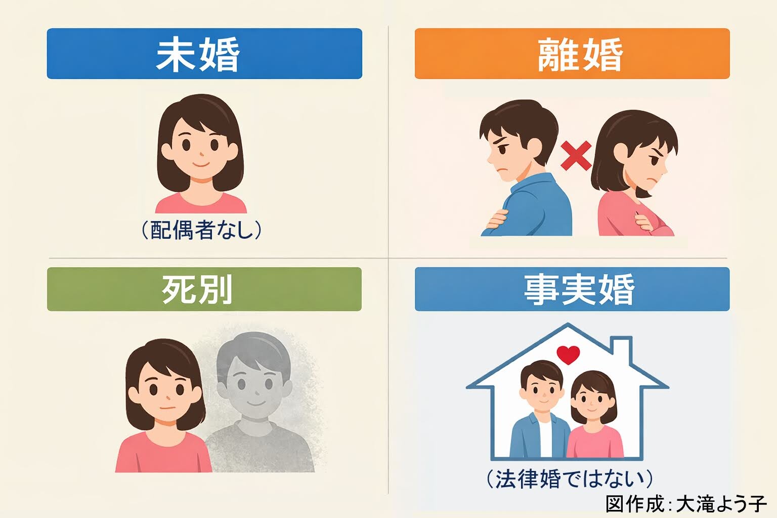 ![]() 「おひとりさまの老後」という言葉を聞くと、多くの人は独身女性を思い浮かべるかもしれません。しかし制度の上では、「おひとりさま」の意味はそれほど単純ではありません。 未婚、離婚、死別、事実婚。同じ「一人」に見えても、制度上の立場は異なります。 特に、年金、相続、医療の同意、身元保証などの場面では、どの立場にあるかによって扱いが変わることがあります。いざというとき自分は制度上どういう扱いになるのか、あらかじめ知っておくことが重要です。 この記事では、ファイナンシャルプランナーで介護士の視点から、いわゆる「おひとりさま」の老後にまつわる制度において、法律上の立場によって扱いがどう変わるかについて考えてみたいと思います。 ■未婚・離婚・死別・事実婚の違い まずは、未婚・離婚・死別・事実婚という4つの立場の違いを整理してみます。 ・未婚 法律上の配偶者がいない状態。配偶者に関する制度は基本的に適用されません。 ・離婚 過去に婚姻関係があったものの、現在は法律上の配偶者がいない状態です。離婚時の制度(年金分割など)はありますが、その後は単身として扱われます。 ・死別 配偶者が亡くなったケースです。条件を満たせば遺族年金などの制度が適用される可能性があります。 ・事実婚 生活の実態として夫婦関係にあっても、法律上の婚姻関係がない状態です。制度によって扱いが異なり、配偶者と認められる場合と認められない場合があります。 ■年金制度で見る違い 制度の違いが分かりやすく現れるのが年金です。死別の場合、一定の条件を満たせば遺族年金を受け取れる可能性があります。一方、未婚の場合はこの制度は基本的にありません。 事実婚の場合は、実態が認められれば遺族年金の対象になることもありますが、すべての制度で同じように扱われるわけではありません。 同じように一人で生活しているように見えても、制度上の立場によって受けられる制度が異なることが分かります。また、対象者は女性だけとは限りません。 ■医療・身元保証の場面で起こること 入院や施設入所の際、「保証人はいますか」と確認される場面があります。介護の現場でも、こうした確認が行われることは珍しくありません。 しかし現実には、 ・親族が遠方に住んでいる ・親族も高齢で頼れない ・関係が疎遠で依頼しにくい といった事情により、保証人の確保が難しいケースも少なくありません。 この問題は未婚の人だけでなく、離婚や死別、事実婚など、さまざまな立場の人に共通して起こり得ます。 近年は単身高齢者の入院や施設入所の場面で「保証人」をどうするのかという問題が社会的にも取り上げられるようになりました。頼れる親族がいない場合には、入院や施設入所の手続きそのものが進まないケースもあります。そのため、単身高齢者の増加を背景に、自治体や民間団体が身元保証を支援する仕組みを整える動きも出てきています。 しかし、こうした制度があること自体を知らないまま、突然必要な場面に直面する人も少なくありません。 ■二人暮らしでも「おひとりさま」になる場合がある 特に注意が必要となるのが事実婚など法律婚でない二人暮らしの場合です。生活の実態は二人暮らしでも、制度では「おひとりさま」が二人(個人単位)として扱われる場面があります。 たとえば、正式に婚姻関係にあった配偶者と死別した場合には、条件を満たせば遺族年金が支給されます。一方で、法律婚ではない関係で同居していた場合には、同じように長く支え合ってきた関係であっても同じ扱いにならないことがあります。 同居して生活を共にしていても、制度の上では「どの関係として位置づけられるのか」が問われます。事実婚の場合には、一定の条件で認められるケースもありますが、その判断はケースによって異なります。 制度は「どの関係にあるか」を前提に設計されており、同居しているという実態だけでは判断されないことがあります。 こうした違いは、年金や住まい、相続、医療の意思決定など、制度が関わる場面で現れます。 医療の意思決定など場面では、入院時の説明や手術の同意などで、家族への連絡や意思確認が求められることがあります。法律婚であれば配偶者が当然のように対応する場面でも、法律婚ではない関係の場合、どこまで認められるのかが問題になることがあります。 また住まいの場面でも似たような問題が生じることがあります。賃貸住宅の契約や更新の際、緊急連絡先や保証人が求められることは珍しくありません。二人で暮らしていても法律婚ではない場合、契約上の家族として扱われないことがあり、手続きが複雑になることもあり得ます。 ■立場によって制度は変わる 未婚、離婚、死別、事実婚。それぞれの立場によって、年金や医療、保証人などの制度の扱いは異なります。自分がどの位置にいるのかを正しく理解しておくことが、将来の備えとして重要になりま